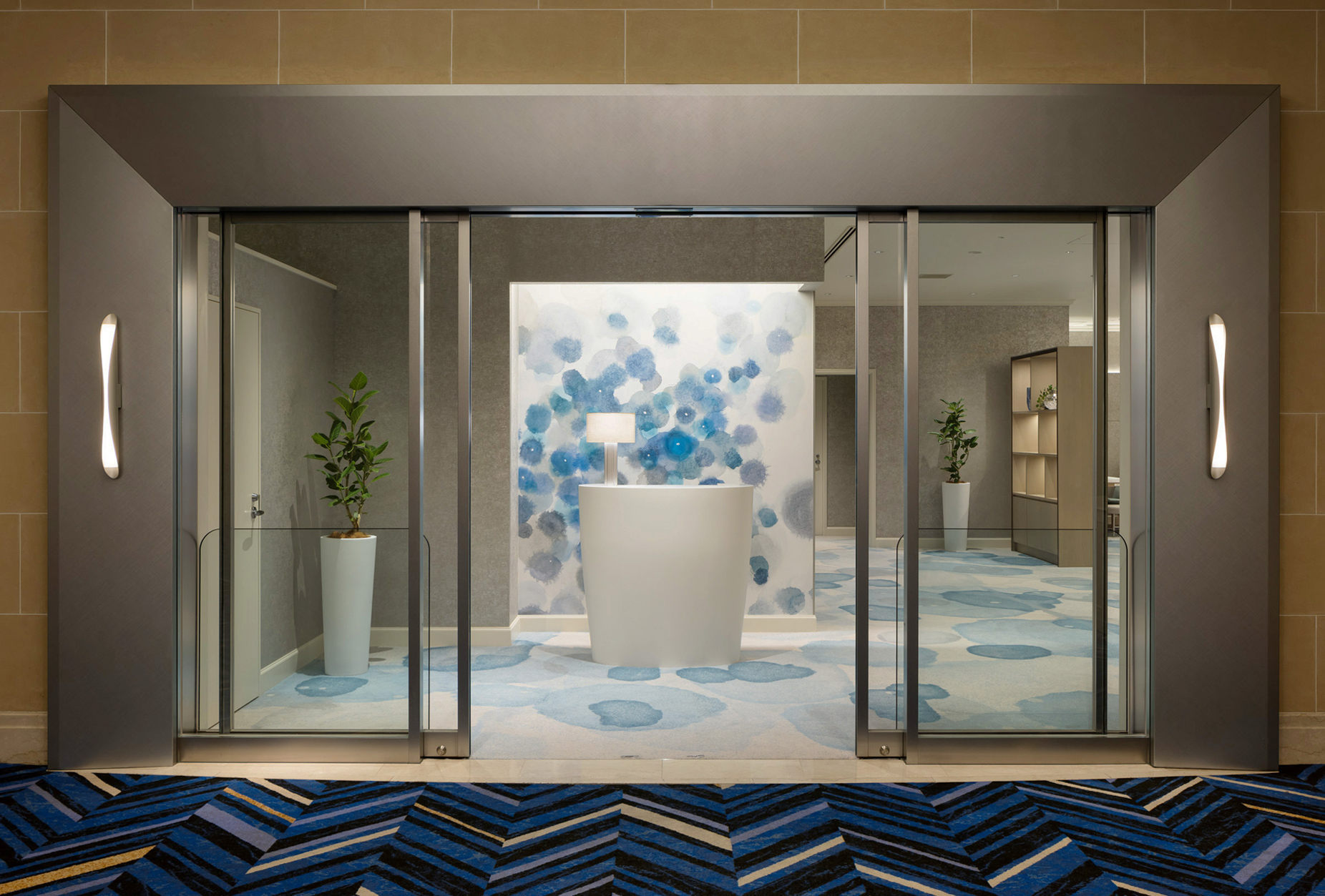 ホールを外と内をつなぐガーデンに見立て、落ちついたシックな空間としています。